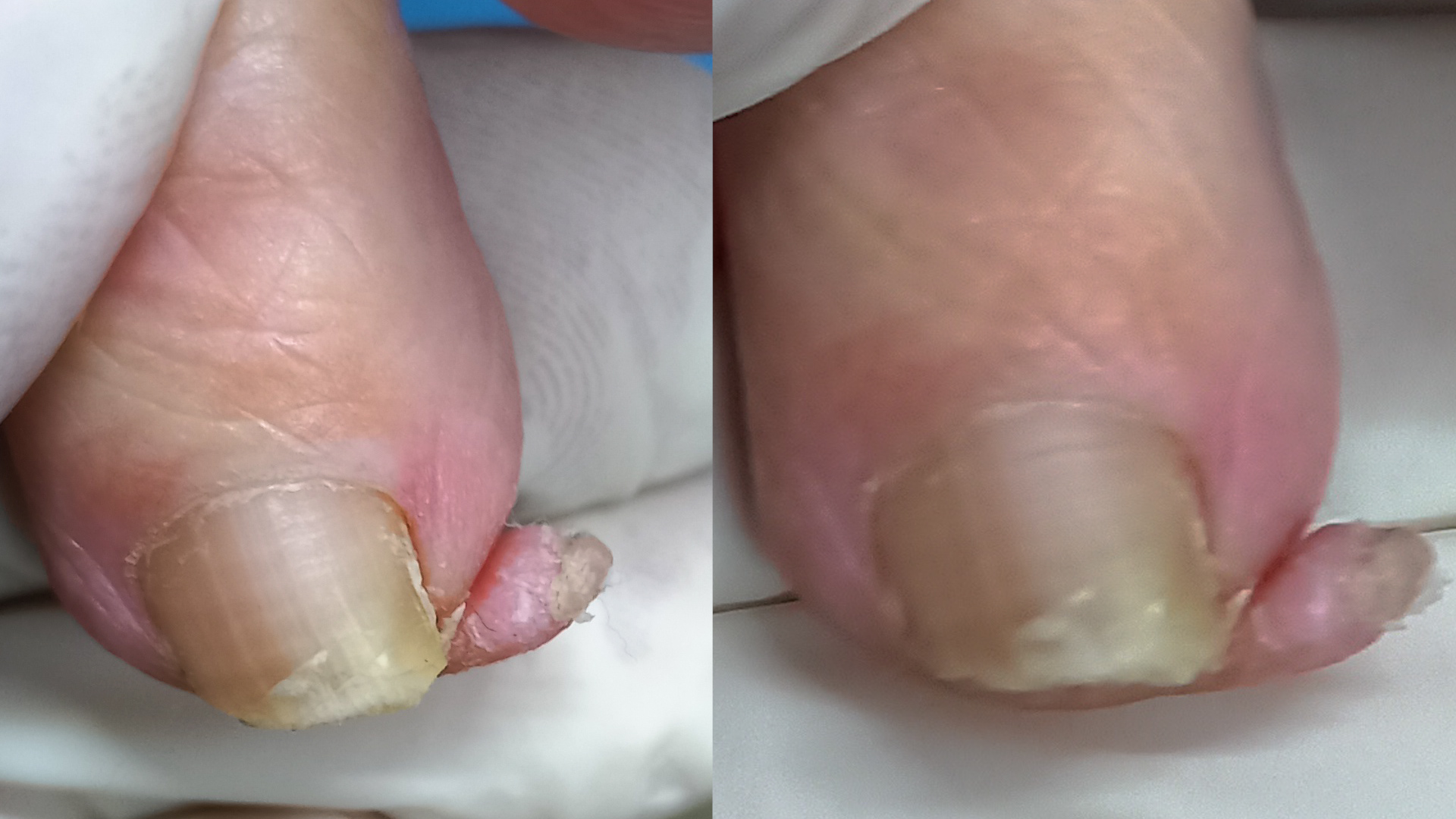 К нам, в Бендерскую Водолечебницу, обратился пациент с просьбой удалить мозоль на пальце ноги. Она жаловалась на сильную боль при ходьбе. Однако, это оказалось совсем не мозоль, фиброзный нарост. Бодобные изменения часто возникают как осложнение хронической грибковой инфекции ногтя (онихомикоза), когда гриб разрушает ногтевую пластину и вызывает воспаление околоногтевого валика. Организм в ответ на постоянное раздражение и микровоспаление формирует избыточную соединительную ткань — фиброзный нарост.