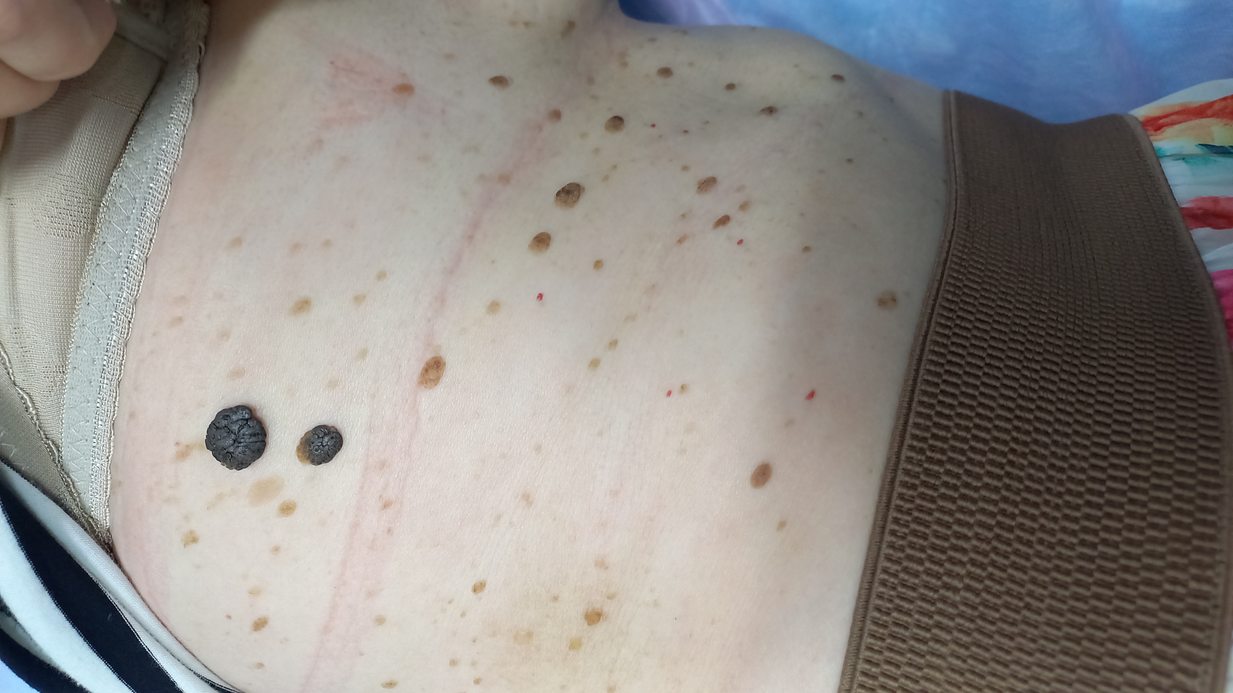 Кератомы это доброкачественные новообразования кожи, возникающее из клеток эпидермиса в результате избыточного ороговения. Чаще всего они появляются у людей старше 40–50 лет под влиянием ультрафиолетового излучения, возрастных изменений и генетической предрасположенности. Кератомы имеют вид плоских или слегка возвышающихся пятен и бляшек желтовато-коричневого или тёмно-коричневого цвета с шероховатой поверхностью, которая со временем может утолщаться и покрываться чешуйками. Хотя сами по себе кератомы не опасны, они могут травмироваться и воспаляться.