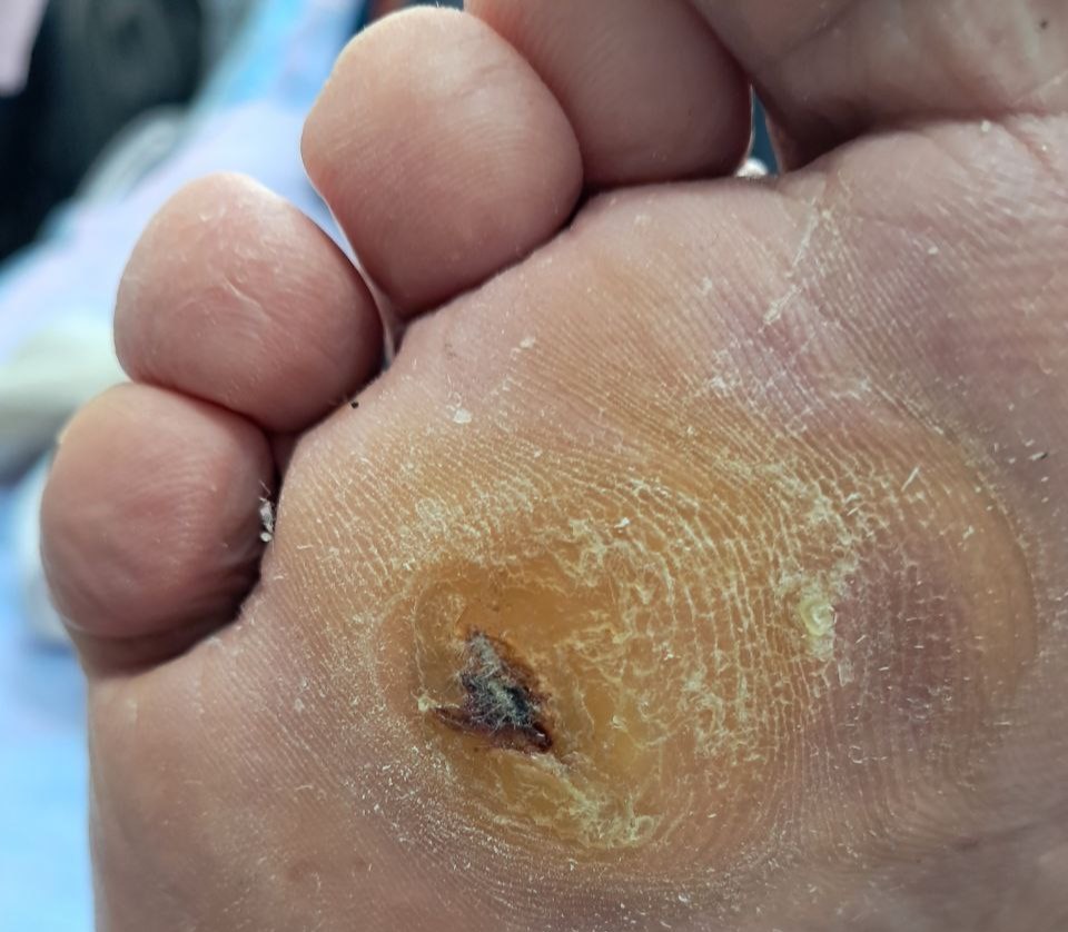 Еще один интересный случай из нашей клинике в Бендерах. Пришел человек с вот такой язвой на стопе. Это гиперкератотическая трофическая язва связанная с сахарным диабетом второй степени. Подобное хроническое поражение кожи и мягких тканей, возникающее из-за нарушения кровообращения и иннервации стопы. Ткани кожи недополучают кислород и питательные вещества, что приводит к их постепенному разрушению. В отличие от обычных трофических язв, диабетические поражения склонны к более выраженному гиперкератозу — утолщению рогового слоя кожи, который формирует плотные налёты вокруг язвенного дефекта.