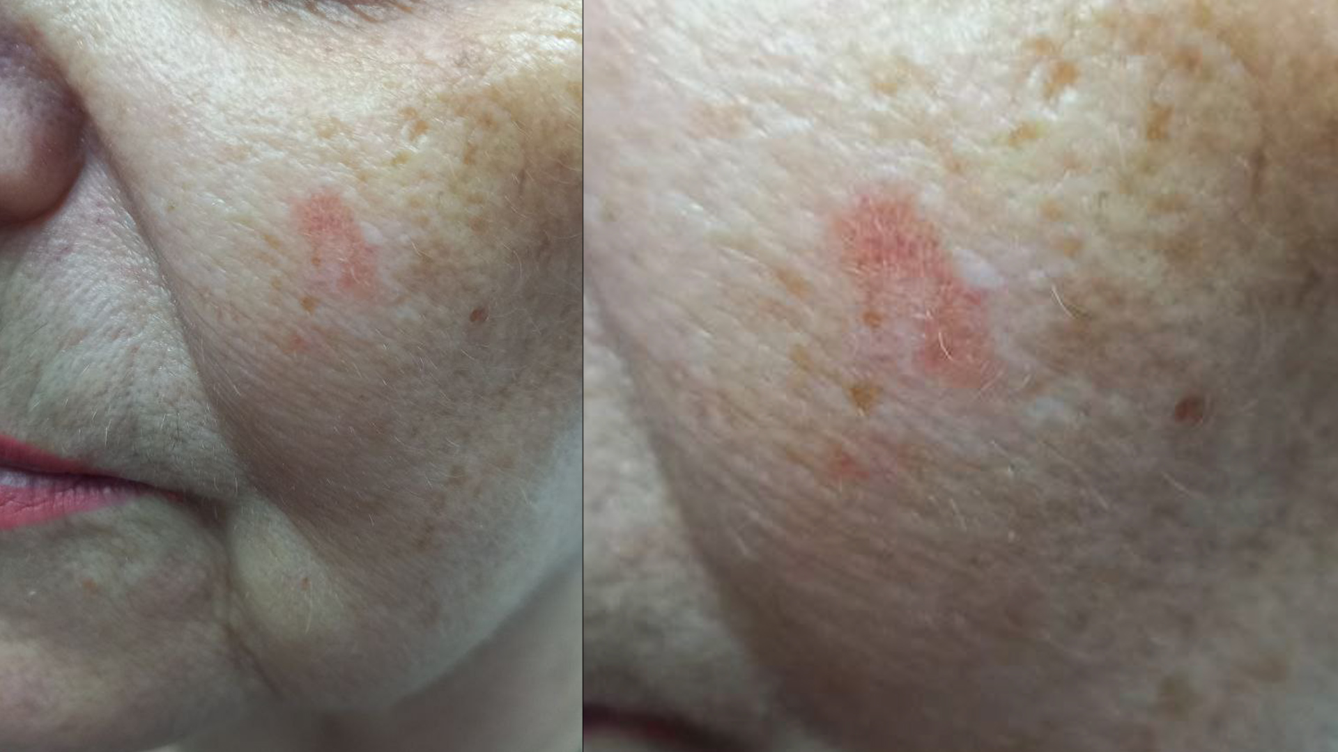 К нам пришёл пациент с этим образованием на коже лица. К сожалению, тут более серьёзный случай чем простая лазерная косметология. Это актинический кератоз. Это предраковое кожное образование, которое возникает в результате длительного воздействия ультрафиолетового излучения на кожу. Чаще всего оно проявляется в виде шероховатых, сухих, шелушащихся или слегка приподнятых пятен на открытых участках тела — лице, ушах, руках, шее или коже головы. Цвет образования может варьировать от телесного до красноватого или коричневатого, а при прикосновении кожа кажется шершавой, как наждачная бумага.